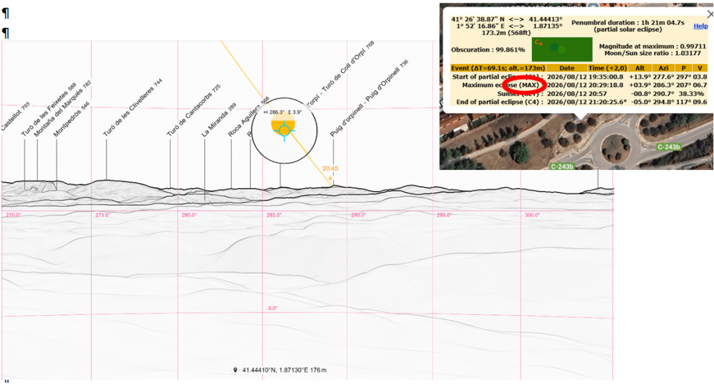 El interface gràfic de xjubier ofereix l’oportunitat de veure les dades de les diferents etapes de l’eclipsi. Fen clic en C1, MAX, SETo C4, podrem veure una simulació del Sol en l’horitzó amb les muntanyes que tenim al voltant i que podrien no deixar veure l’eclipsi. Això si, no ens ensenyarà ni les cases ni els arbres que tenim al voltant.