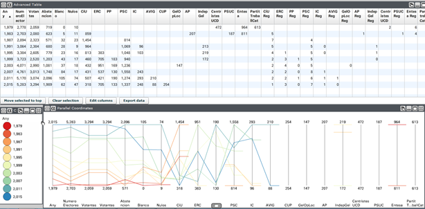 Visualizar i analitzar los datos con Weave. Gráficos de barras interactivos de las elecciones Municipales en GELIDA desde 1979 a 2011 en función de los tres o dos «CirCensal» Distritos-Sección existentes 01001, 01002 y 02001. Los gráficos de barras están agrupados por años y por Distritos-Sección. Los datos del numero de electores están tomados de las elecciones al Parlamento de ese mismo año. Los datos de la tabla son exportables. Solamente necesitas hacer clic en el link y explorar con el ratón en el tablero.
